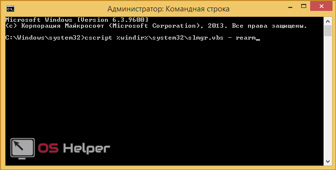 - Далее нужно задать команду «slmgr –rearm» подождать её выполнения.