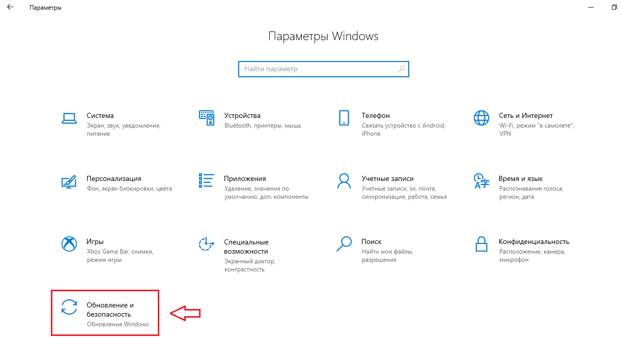 - Далее в окне с несколькими вкладками перейти в раздел «Обновление и безопасность».